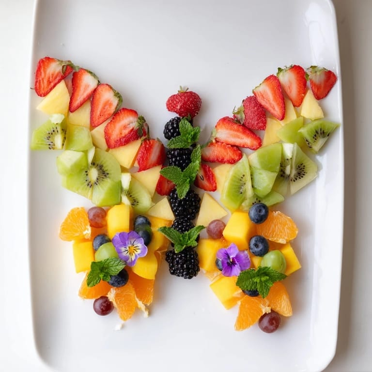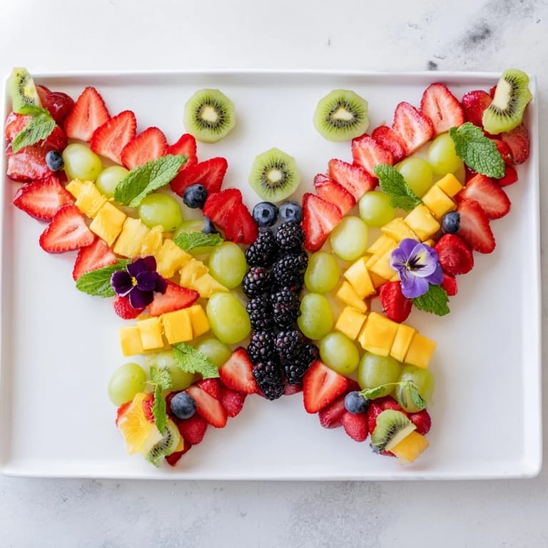 Save A vibrant and whimsical fruit platter arranged in the shape of a butterfly, perfect for parties, brunches, or special occasions. Fresh, colorful fruits are artfully displayed to create an eye-catching edible centerpiece.