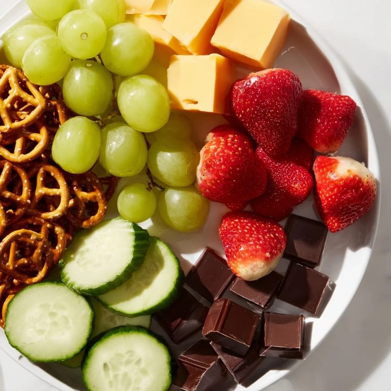 This snack tray brings joy to any table with its colorful clusters and tasty variety. The combination of fresh vegetables, juicy fruits, flavorful cheeses, and crunchy pretzels or crackers makes for an inviting presentation that's as fun to assemble as it is to eat.