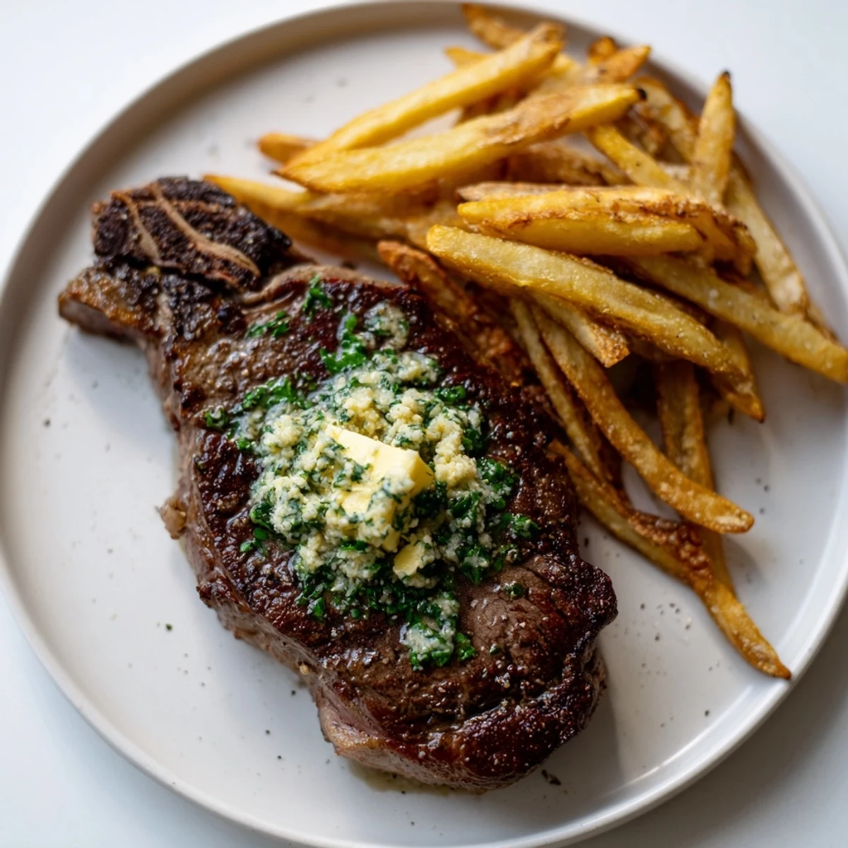 Save A classic steakhouse favorite featuring perfectly seared steak topped with rich garlic-herb butter, served with crisp golden fries.