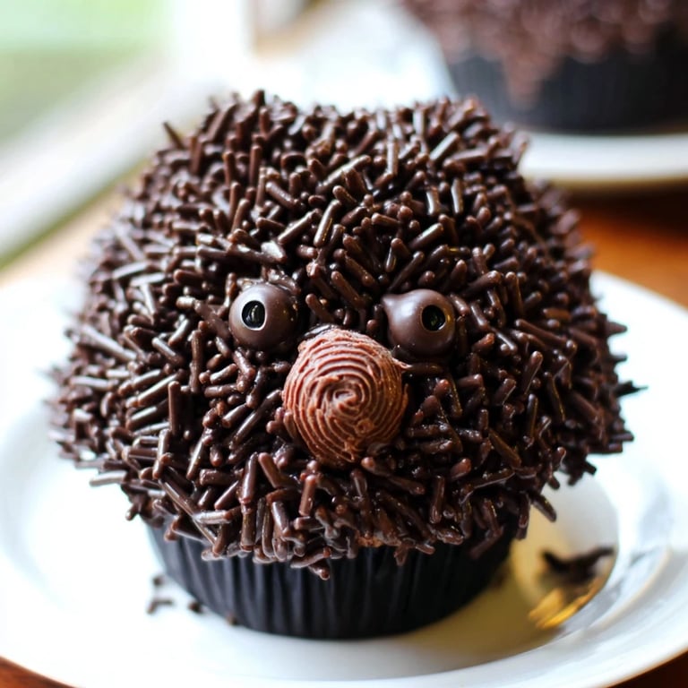 - Dip the frosted cupcakes into chocolate sprinkles, covering the top and sides to resemble hedgehog spikes.