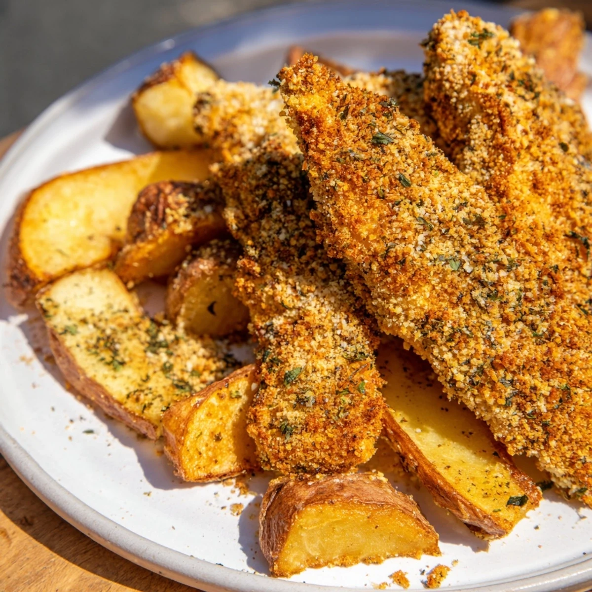 Save Juicy chicken tenders coated in fragrant herbs served with crispy golden-brown potato wedges create a wholesome and flavorful meal the whole family will love.