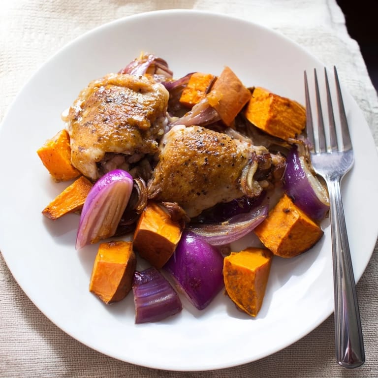 Save Tender chicken thighs and sweet potatoes are roasted together in a luscious maple glaze, creating a comforting, sweet-savory meal perfect for any night of the week.