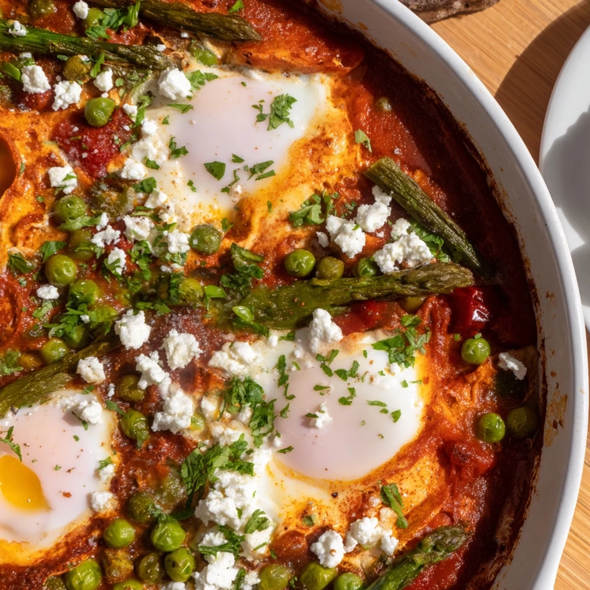 Save Experience a fresh twist on a classic Middle Eastern favorite with this vibrant Pea and Broad Bean Shakshuka. Perfect for a colorful spring brunch or a healthy sharing main course, this dish swaps some of the heavy tomato base for a garden-fresh medley of tender asparagus, peas, and broad beans, all simmered in a beautifully spiced herb sauce.