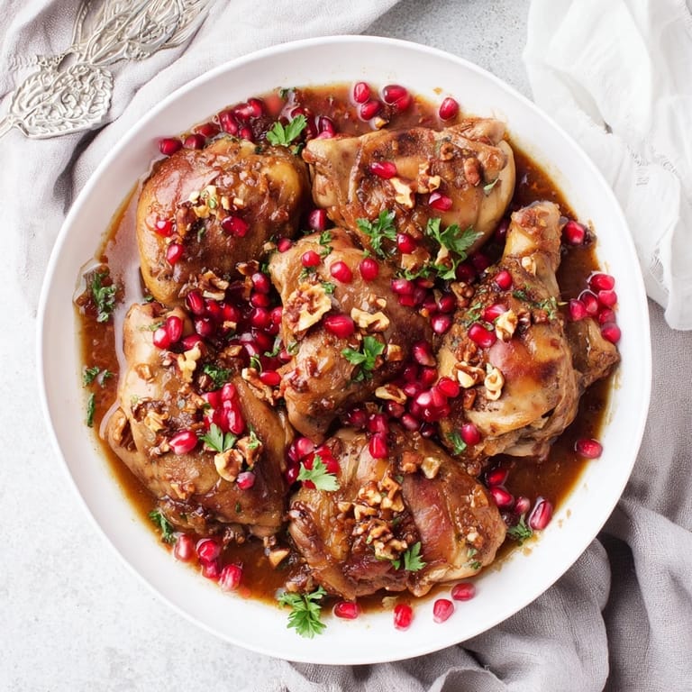 Save A rich, tangy-sweet Persian stew featuring tender chicken thighs simmered in a luscious sauce of ground walnuts and pomegranate molasses. This affordable version maintains authentic flavor while being budget-friendly.