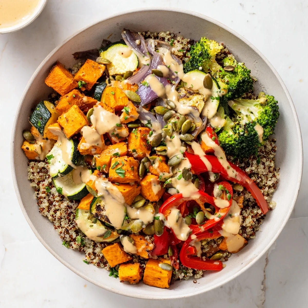 Save A vibrant, healthy bowl featuring nutty quinoa and a medley of roasted seasonal vegetables, topped with a zesty lemon-tahini dressing. Perfect for meal prep or a light lunch.