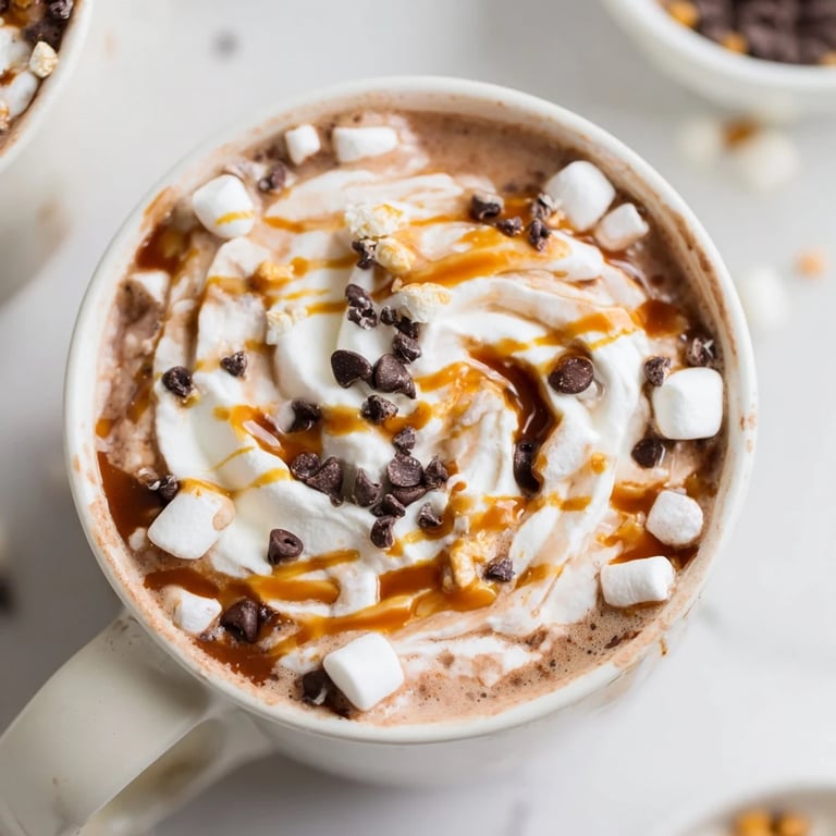 Save A festive, interactive holiday drink setup featuring rich hot cocoa and a variety of delightful toppings—perfect for gatherings and cozy nights.