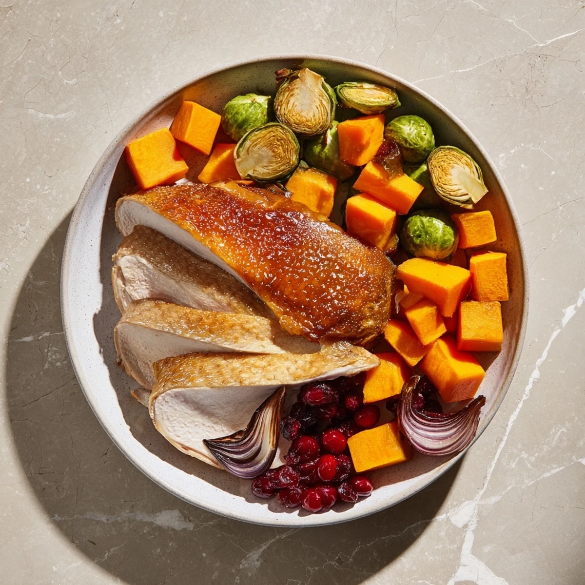 - Slice the turkey and serve with roasted vegetables, drizzling with the remaining cranberry glaze.