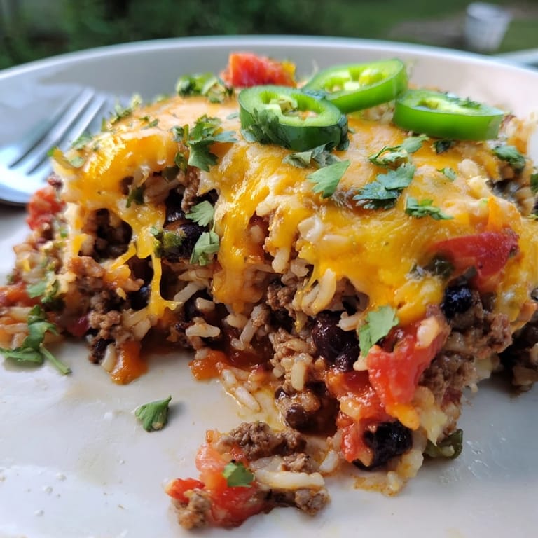 Save A hearty, comforting casserole packed with seasoned ground beef, tender rice, beans, and melty cheese, all baked in a zesty Tex-Mex tomato sauce.