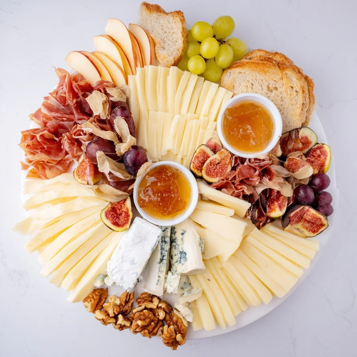 - Charcuterie (optional for non-vegetarian): 80 g prosciutto, 80 g dry-cured salami, sliced, 80 g smoked duck breast, thinly sliced